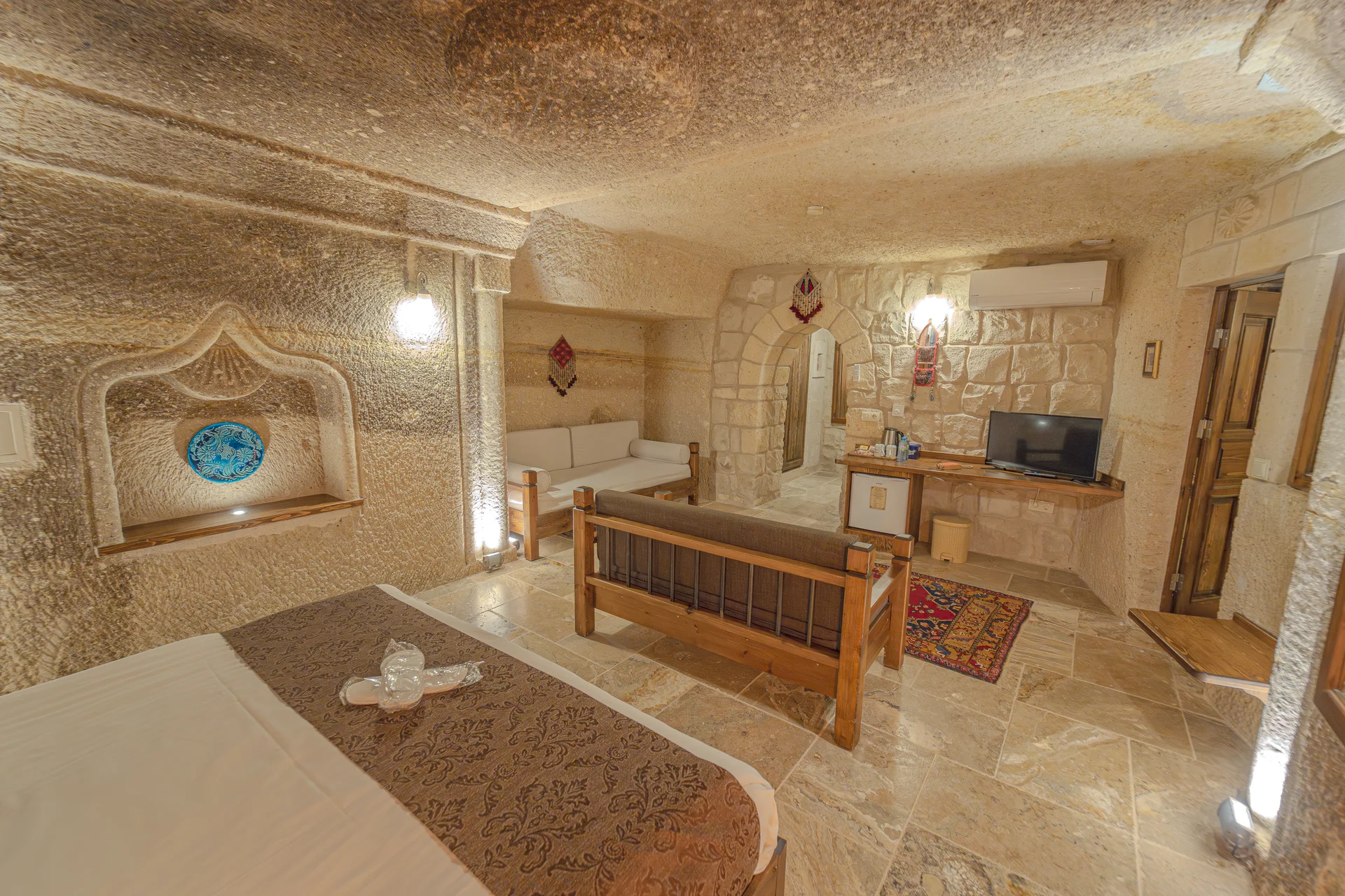 Oda, konaklamanız boyunca optimal konfor sağlayan yerden ısıtma sistemi ile donatılmıştır. 30 m²'lik geniş düzeni ile bu superior mağara odası, 3 misafiri rahatça ağırlayabilir ve Kapadokya'nın büyülü manzarasında unutulmaz bir mağara otel deneyimi arayan çiftler veya küçük aileler için mükemmeldir.