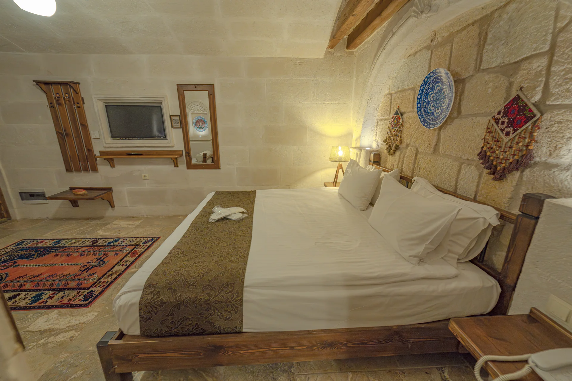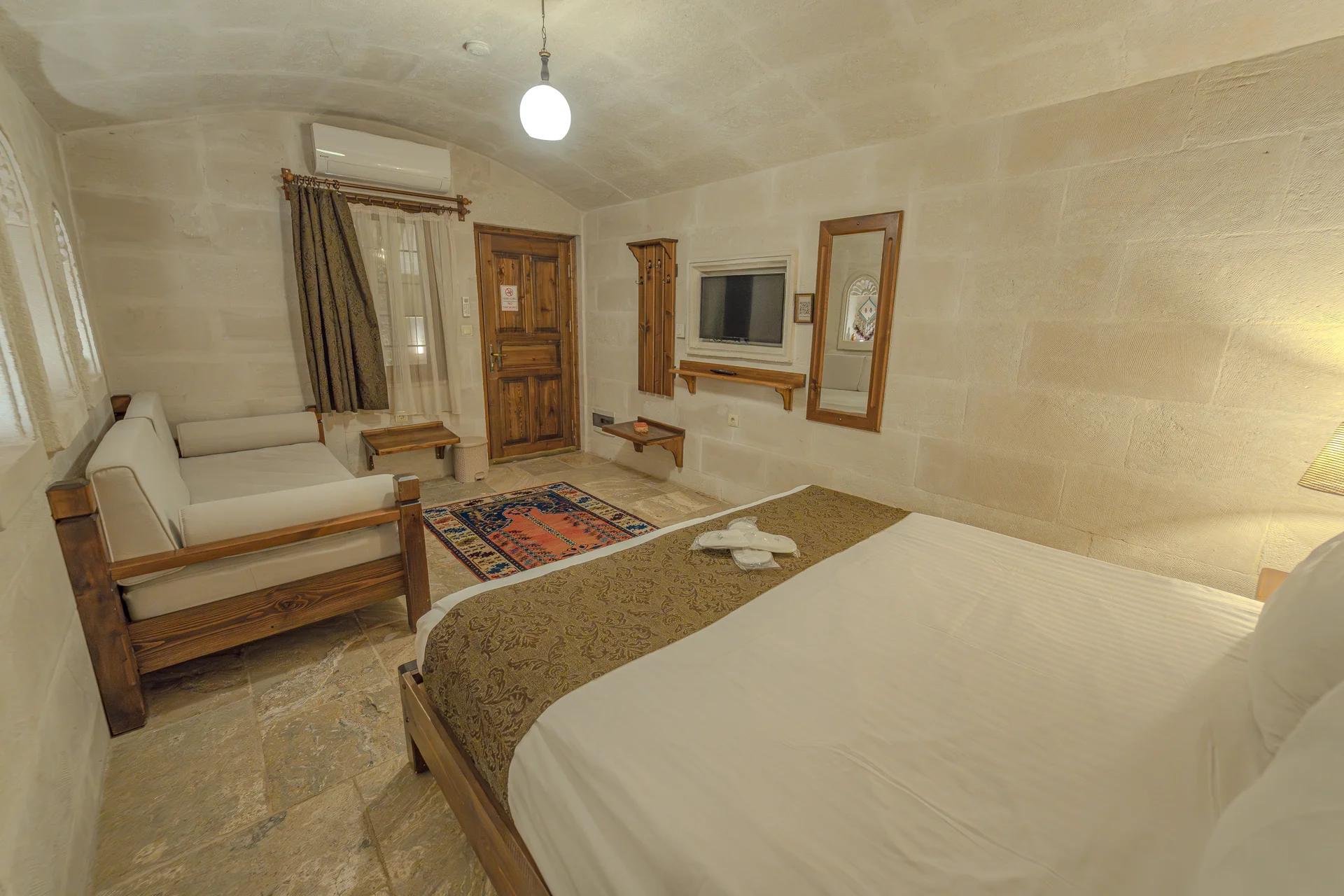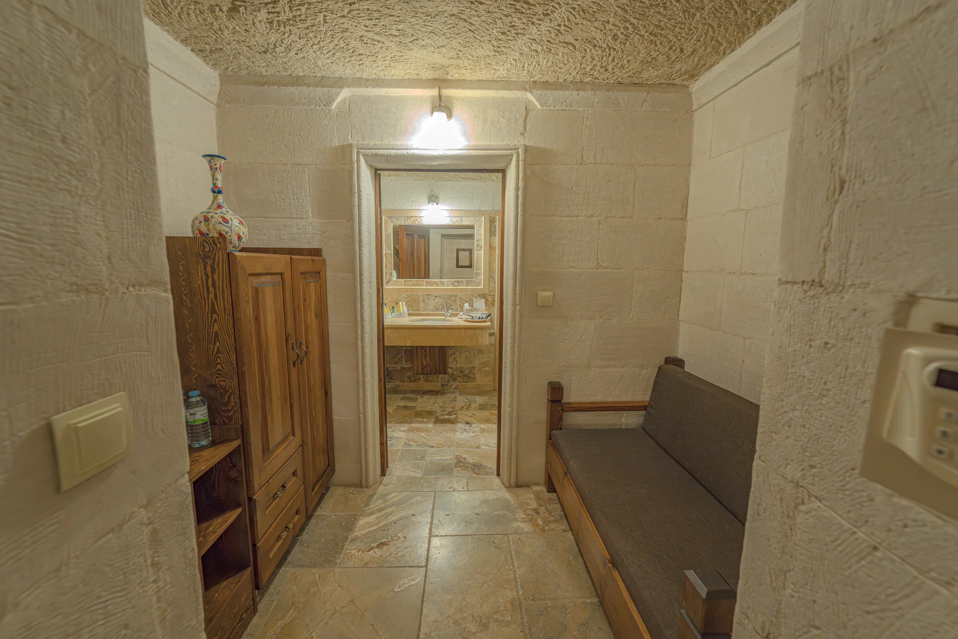 Oda, konaklamanız boyunca konfor için yerden ısıtma sistemi ile donatılmıştır. 22 m²'lik düzeni ile bu standart mağara odası, 3 misafiri rahatça ağırlayabilir ve Kapadokya'da uygun fiyatlı mağara otel deneyimi arayan çiftler için idealdir.