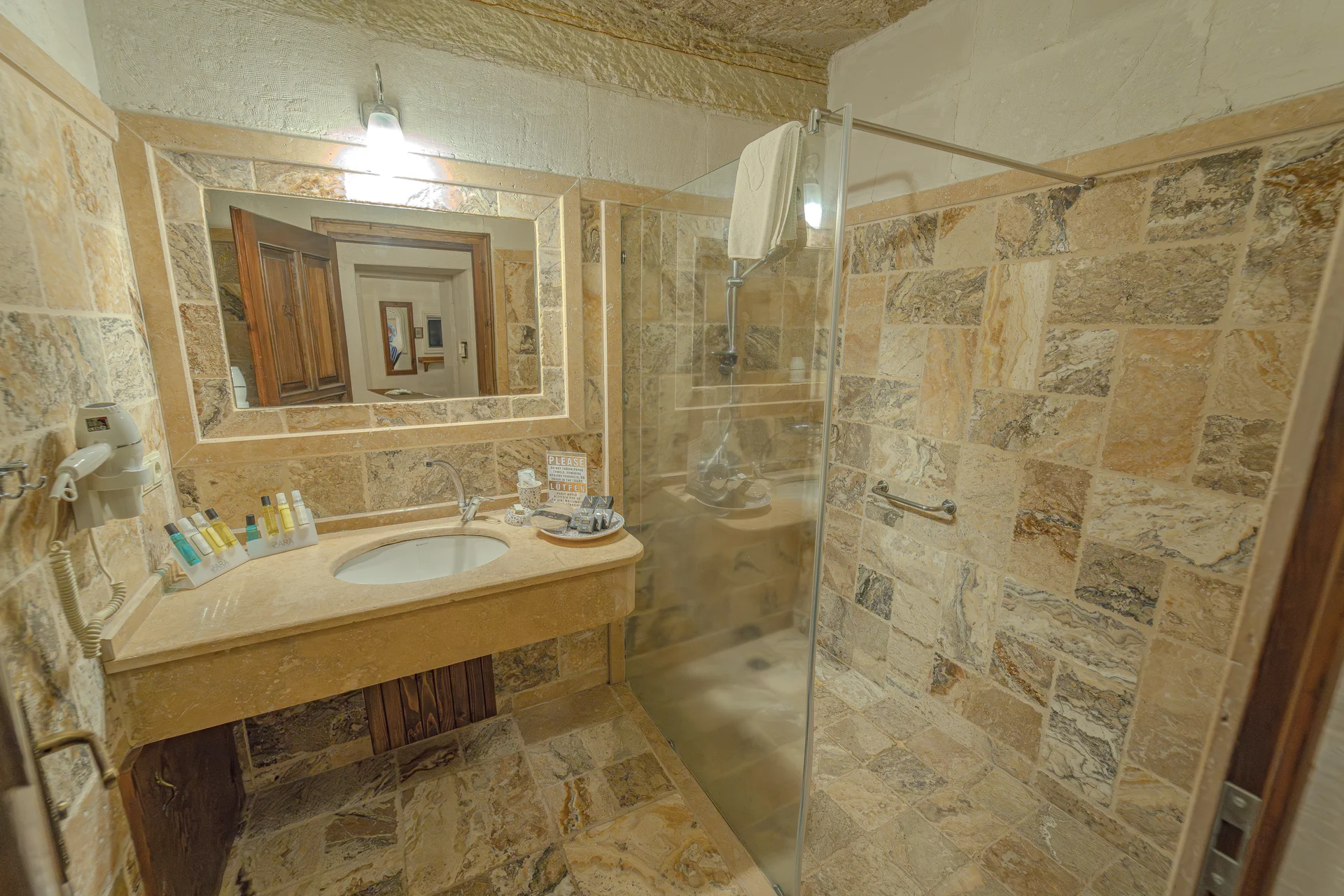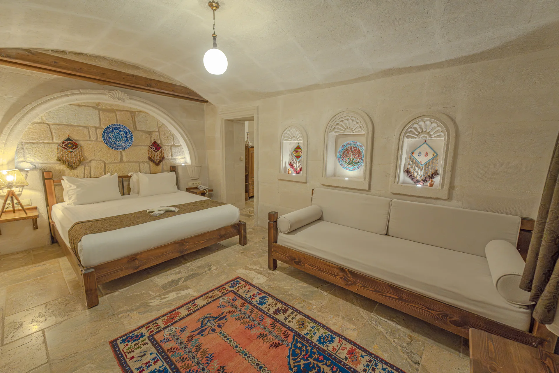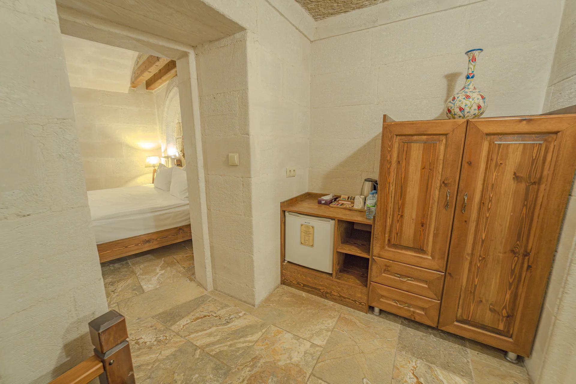 Oda, konaklamanız boyunca konfor için yerden ısıtma sistemi ile donatılmıştır. 22 m²'lik düzeni ile bu standart mağara odası, 3 misafiri rahatça ağırlayabilir ve Kapadokya'da uygun fiyatlı mağara otel deneyimi arayan çiftler için idealdir.