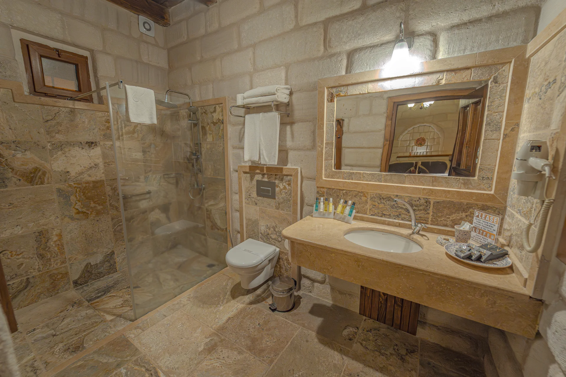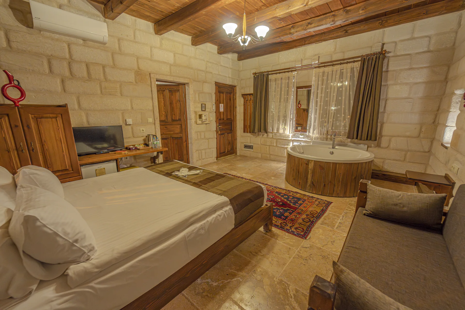 La habitación está equipada con un sistema de calefacción por suelo radiante para un confort óptimo durante su estancia. Con un diseño de 25 m², esta habitación cueva superior puede alojar cómodamente a 4 huéspedes y es perfecta para familias que buscan una experiencia de calidad en un hotel cueva en Capadocia.