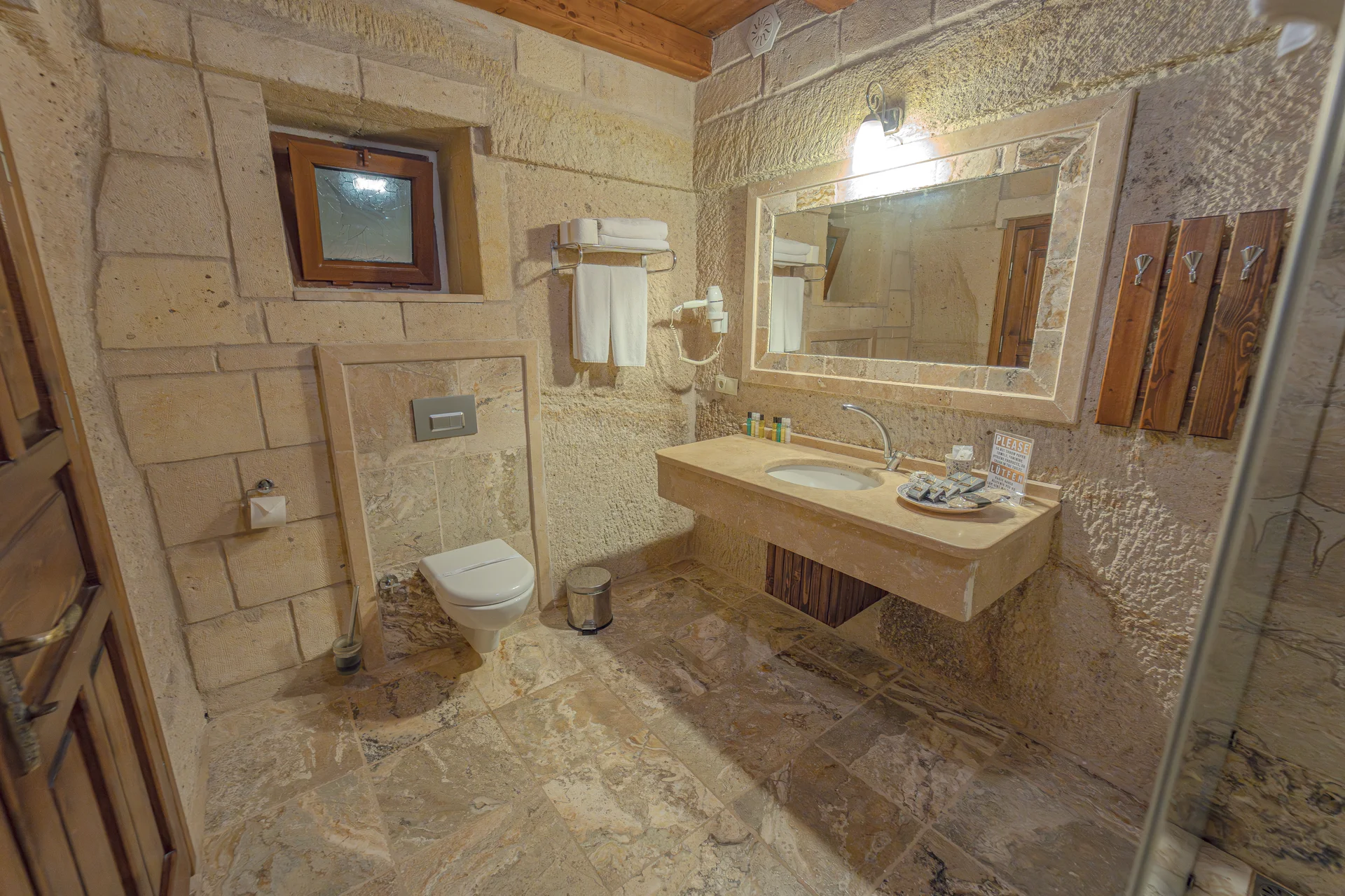 The room is equipped with an underfloor heating system ensuring optimal comfort throughout your stay. With a spacious 30 m² layout, this superior cave room can comfortably accommodate up to 3 guests, making it perfect for couples or small families seeking an unforgettable cave hotel experience in the magical landscape of Cappadocia.