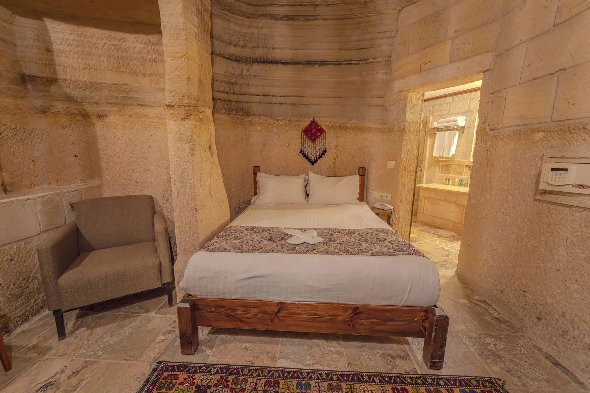 In Cappadocia, Göreme, one of the fairy chimneys that are the subject of fairy tales is also located in our hotel. This fairy chimney room offers a unique experience carved directly into the natural rock formation, providing guests with an authentic cave dwelling experience that has been part of Cappadocian culture for centuries.