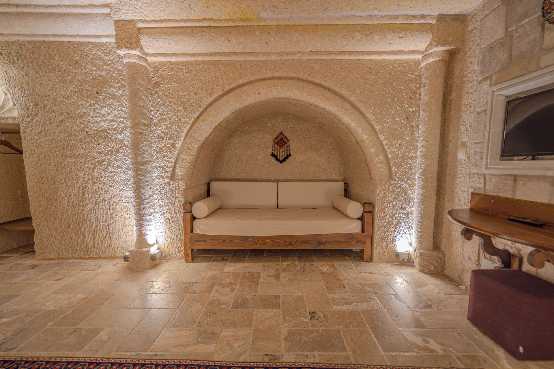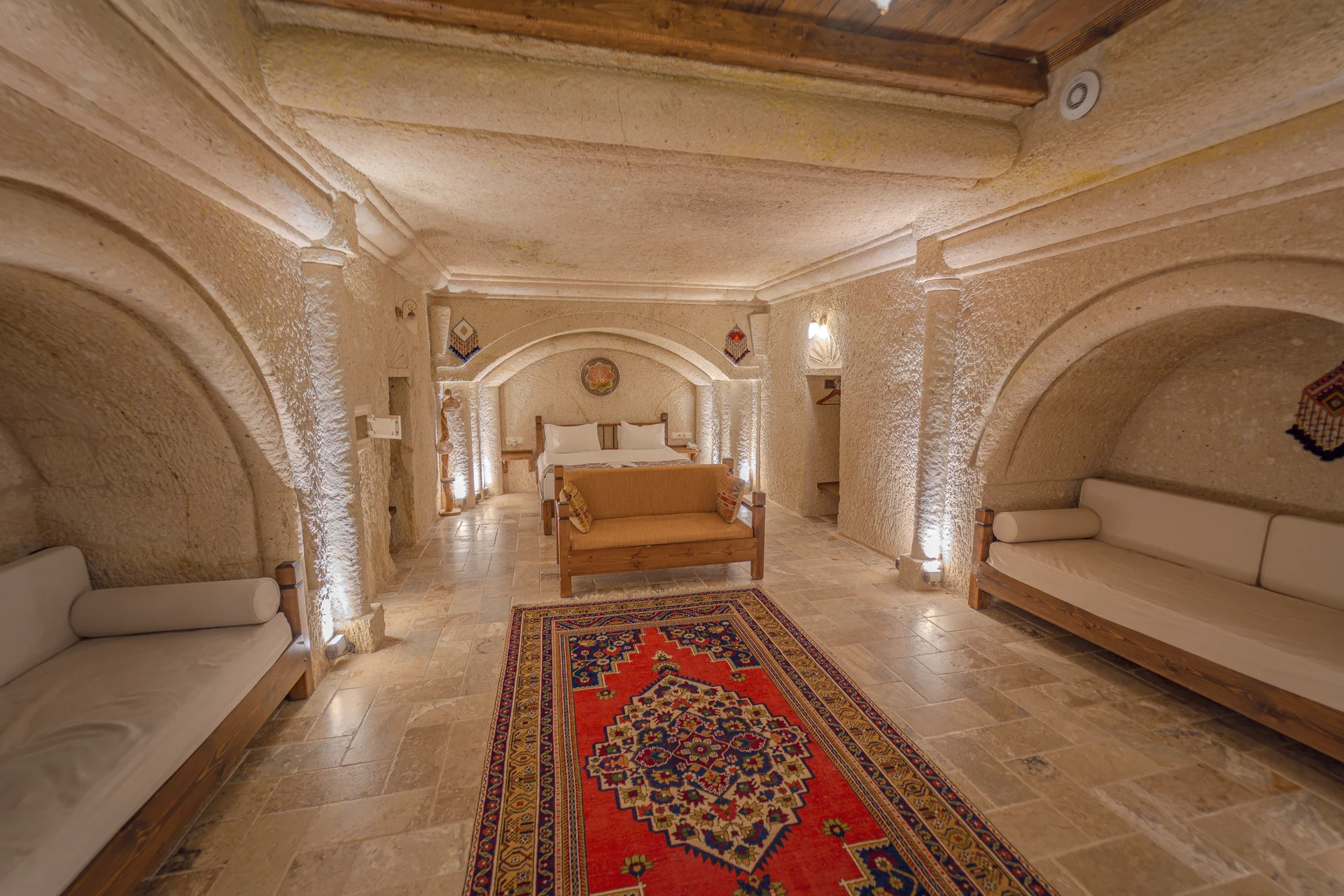 The room is equipped with an underfloor heating system for perfect comfort during your stay. With a spacious 40 m² layout and a king-size bed, this cave room can accommodate 4 guests in luxury and is perfect for couples seeking an unforgettable cave hotel experience in Cappadocia.