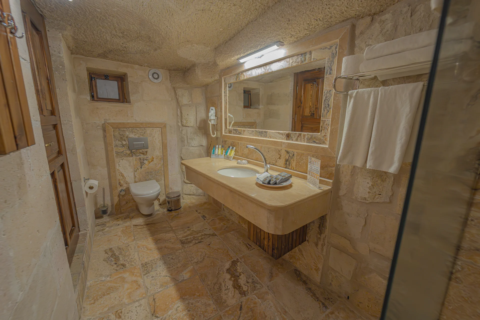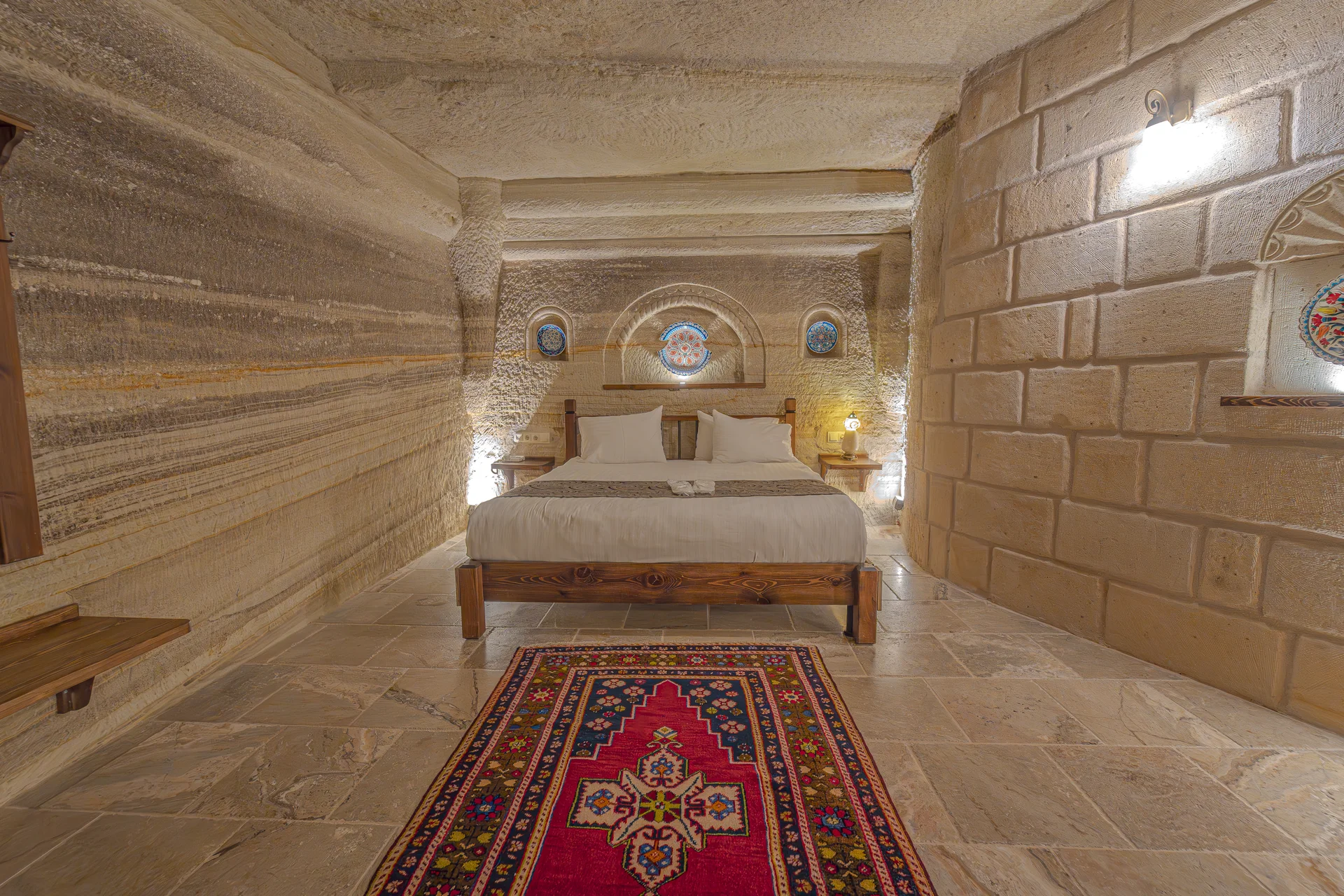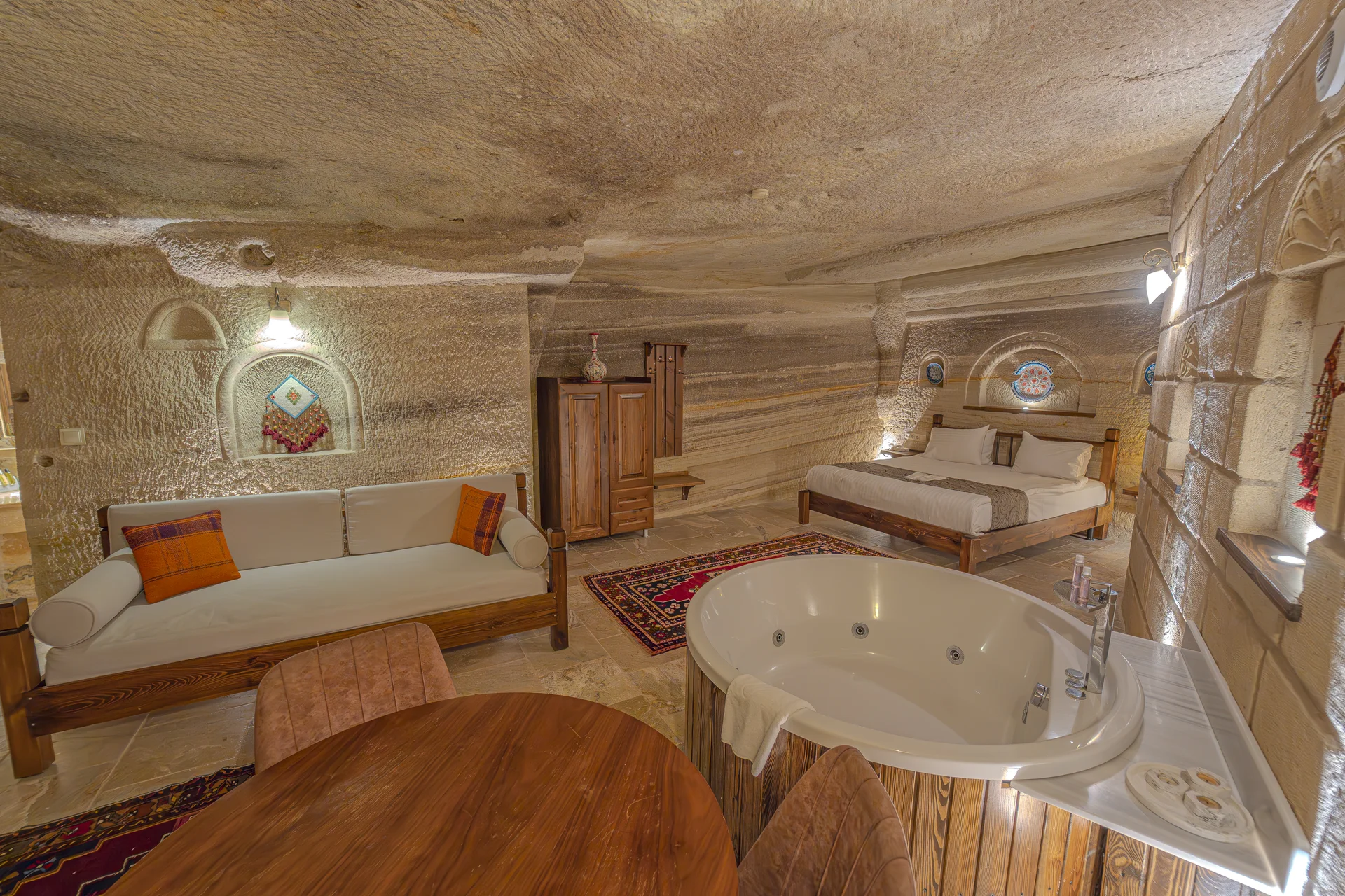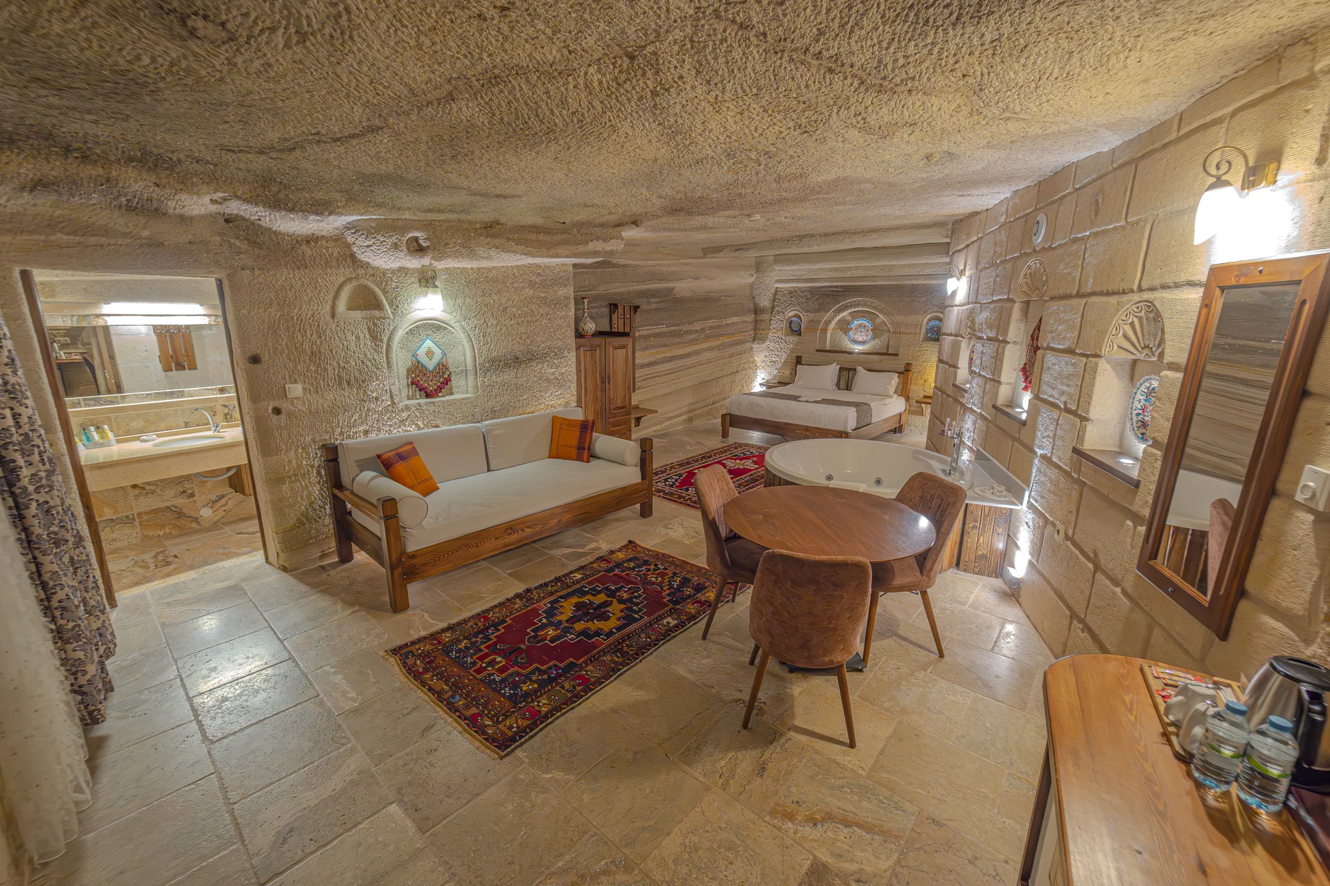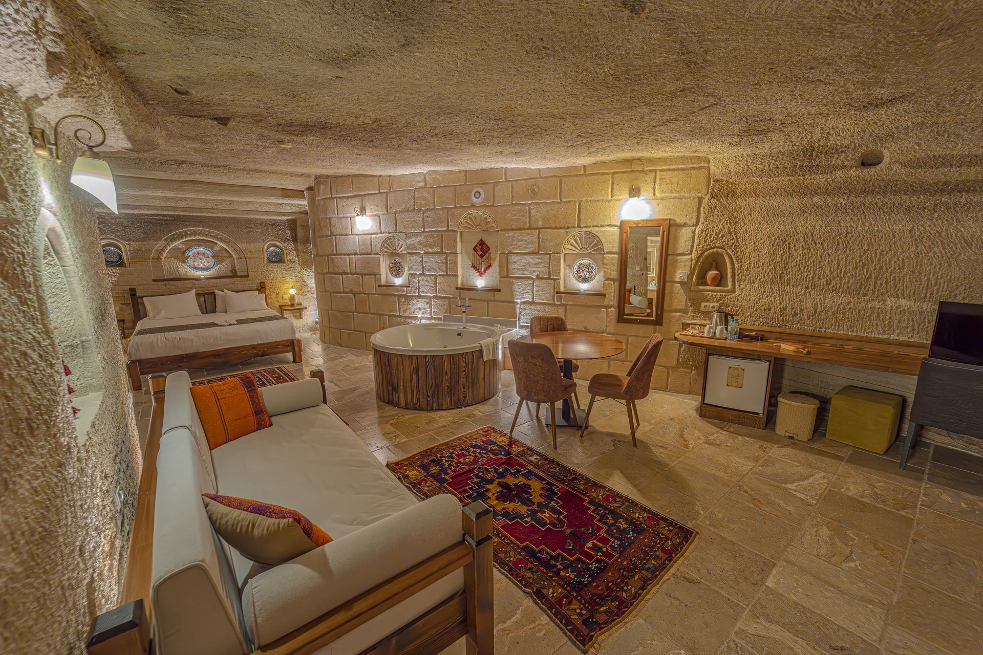 The room is equipped with an underfloor heating system for supreme comfort during your stay. With a spacious 38 m² layout, a king-size bed, and a private jacuzzi, this cave room can accommodate 3 guests in luxury and is perfect for couples seeking an unforgettable romantic cave hotel experience in Cappadocia.