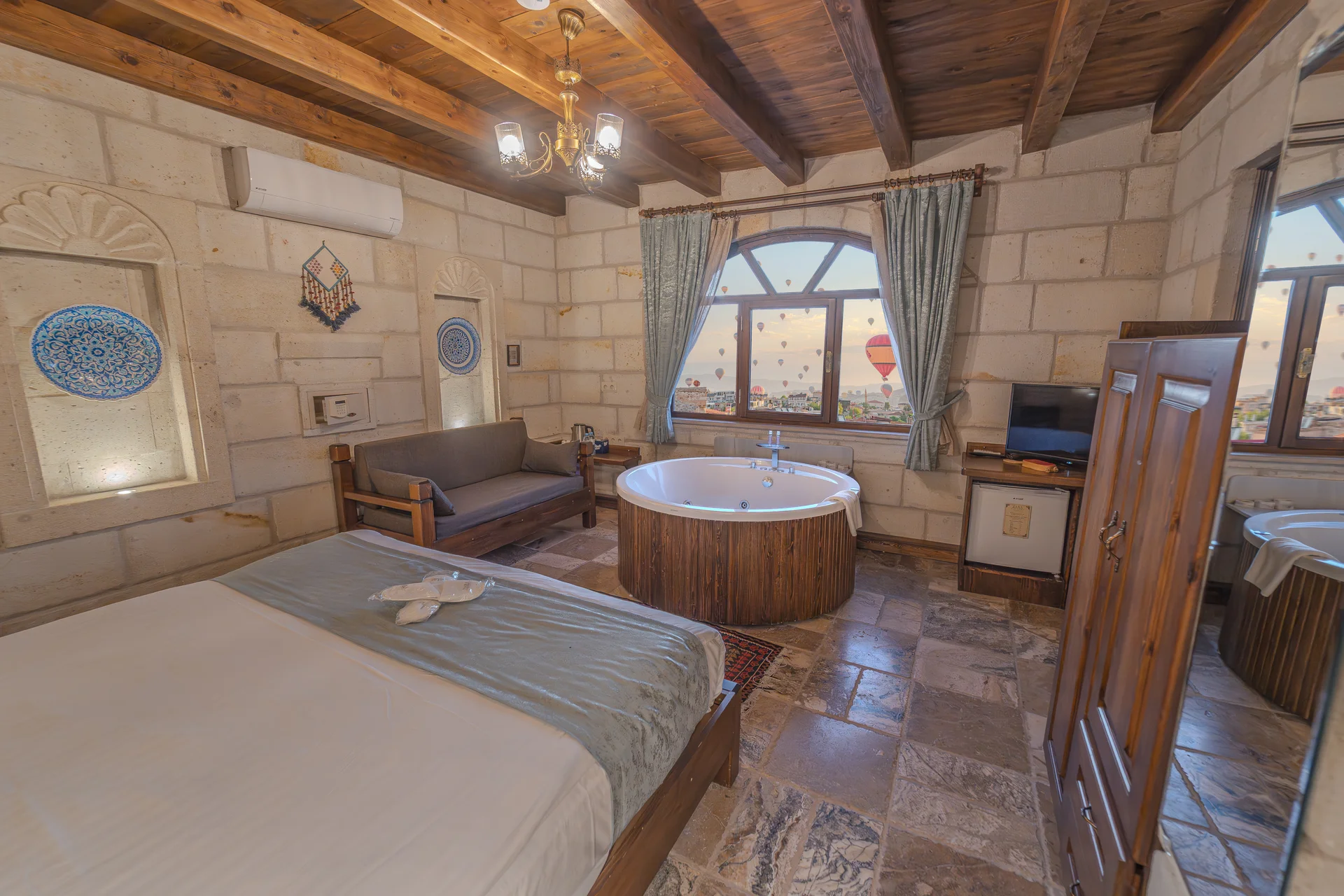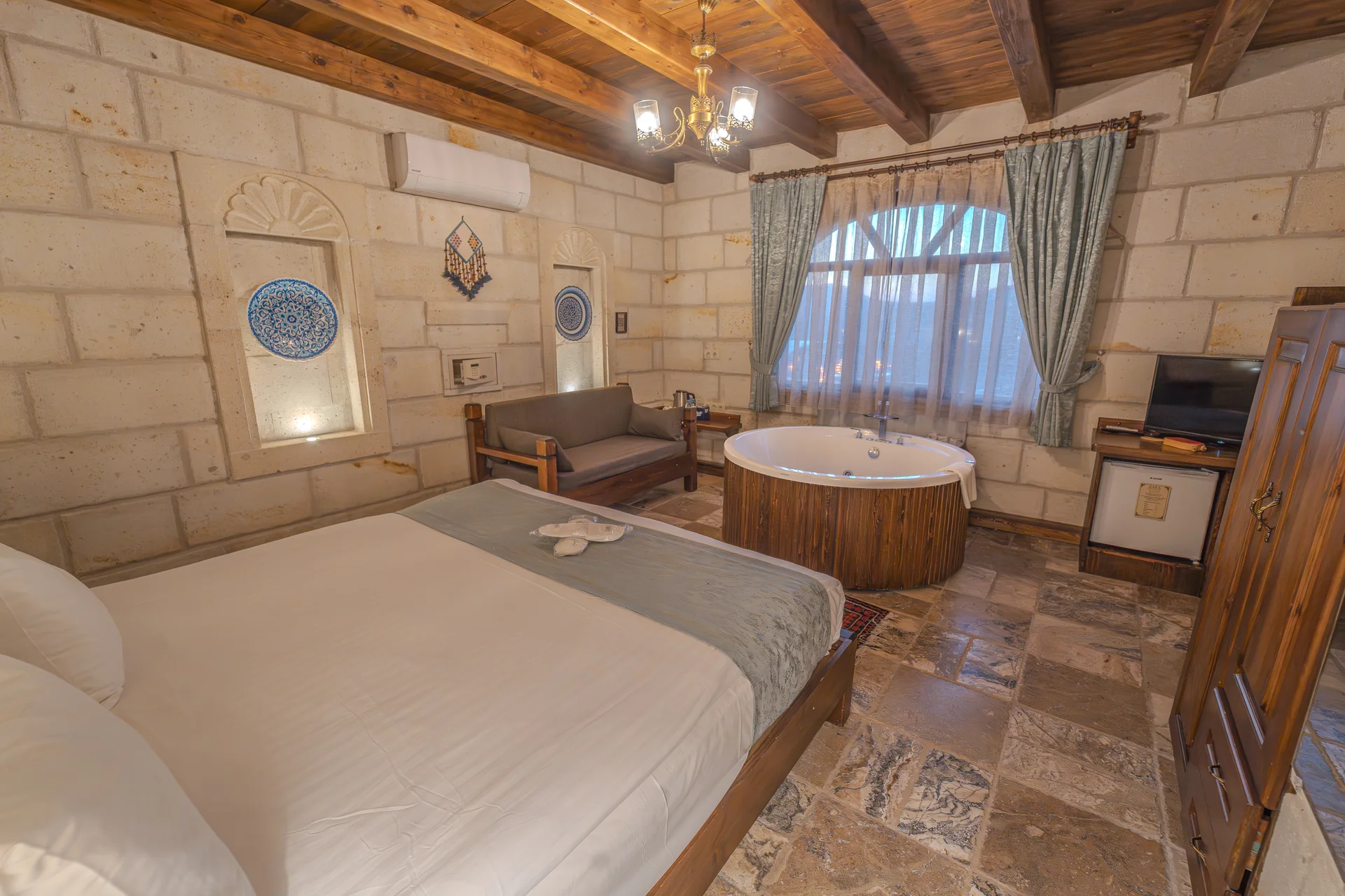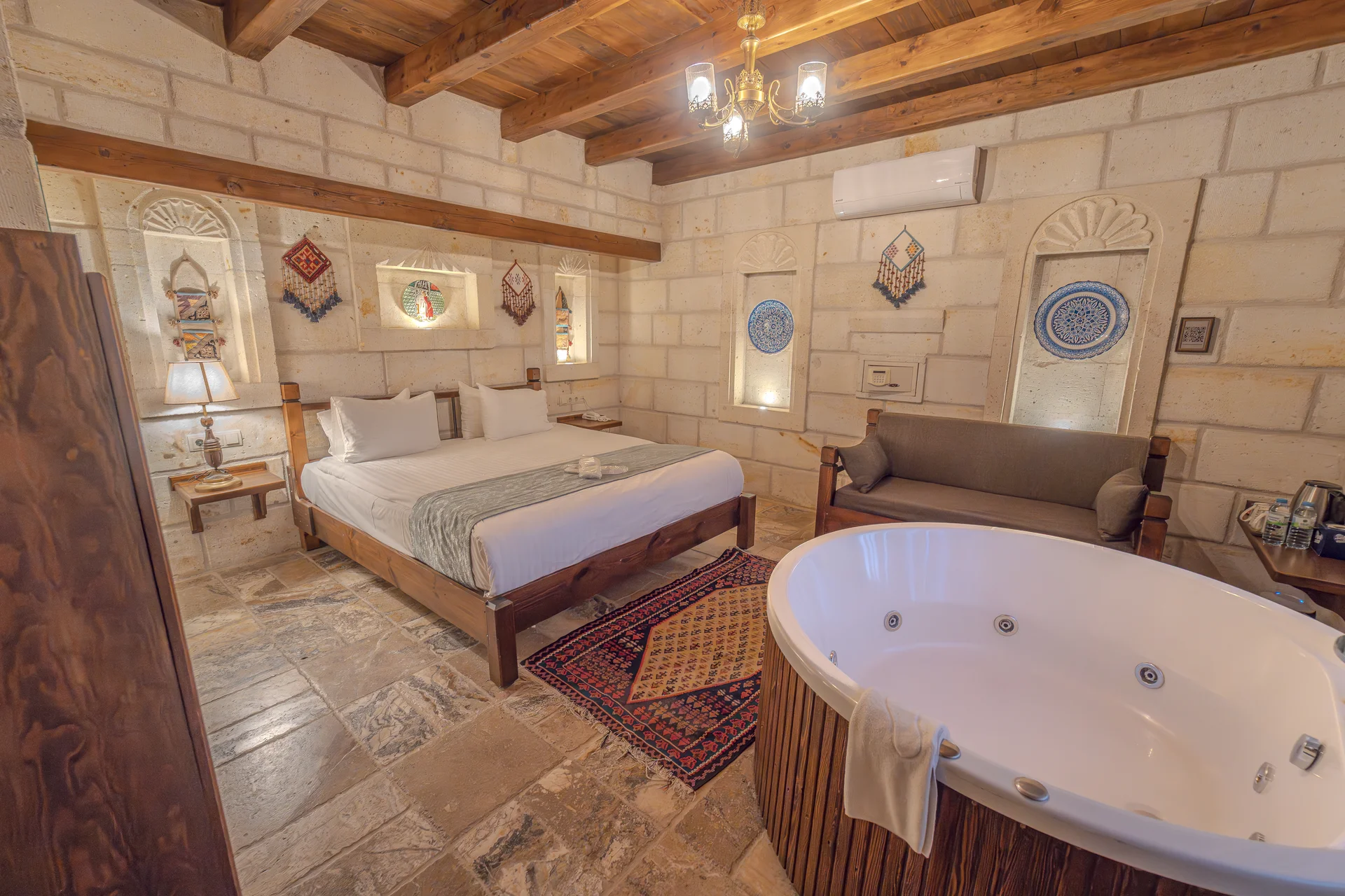 The room is equipped with an underfloor heating system for comfort during your stay. With a 22 m² layout, this standard cave room can comfortably accommodate 2 guests and is ideal for couples seeking an affordable and authentic cave hotel experience in Cappadocia.