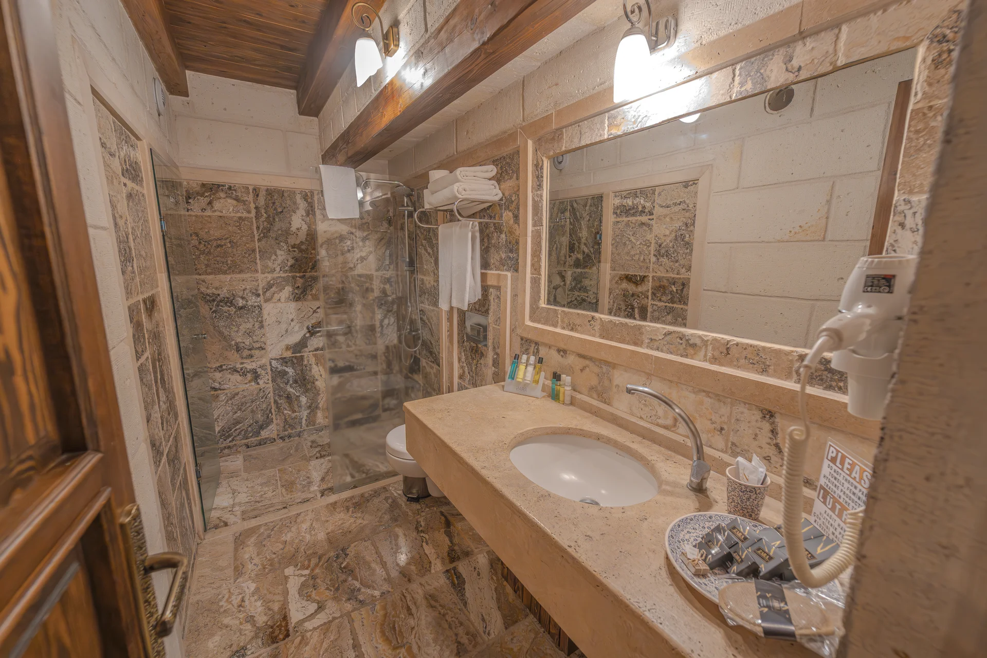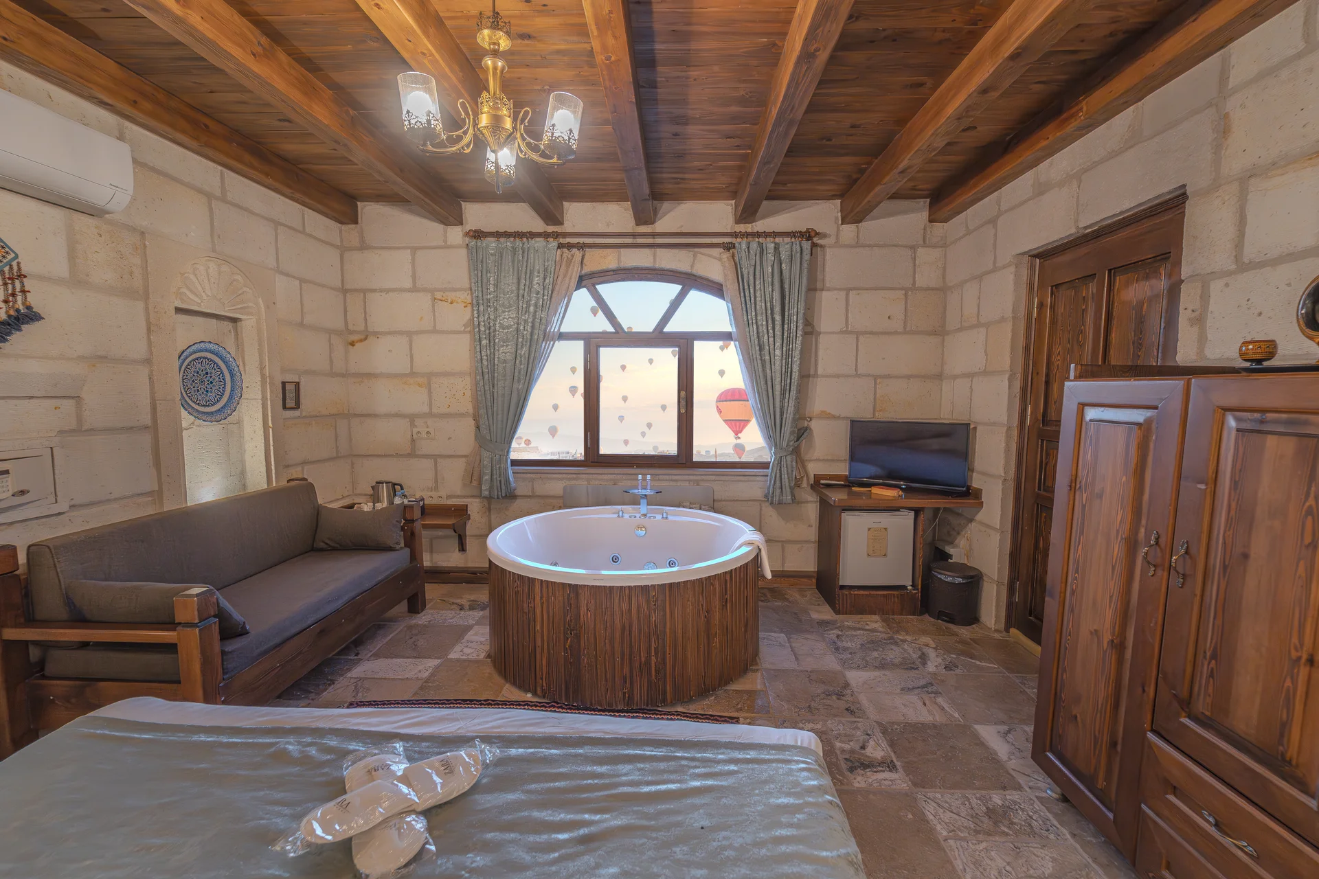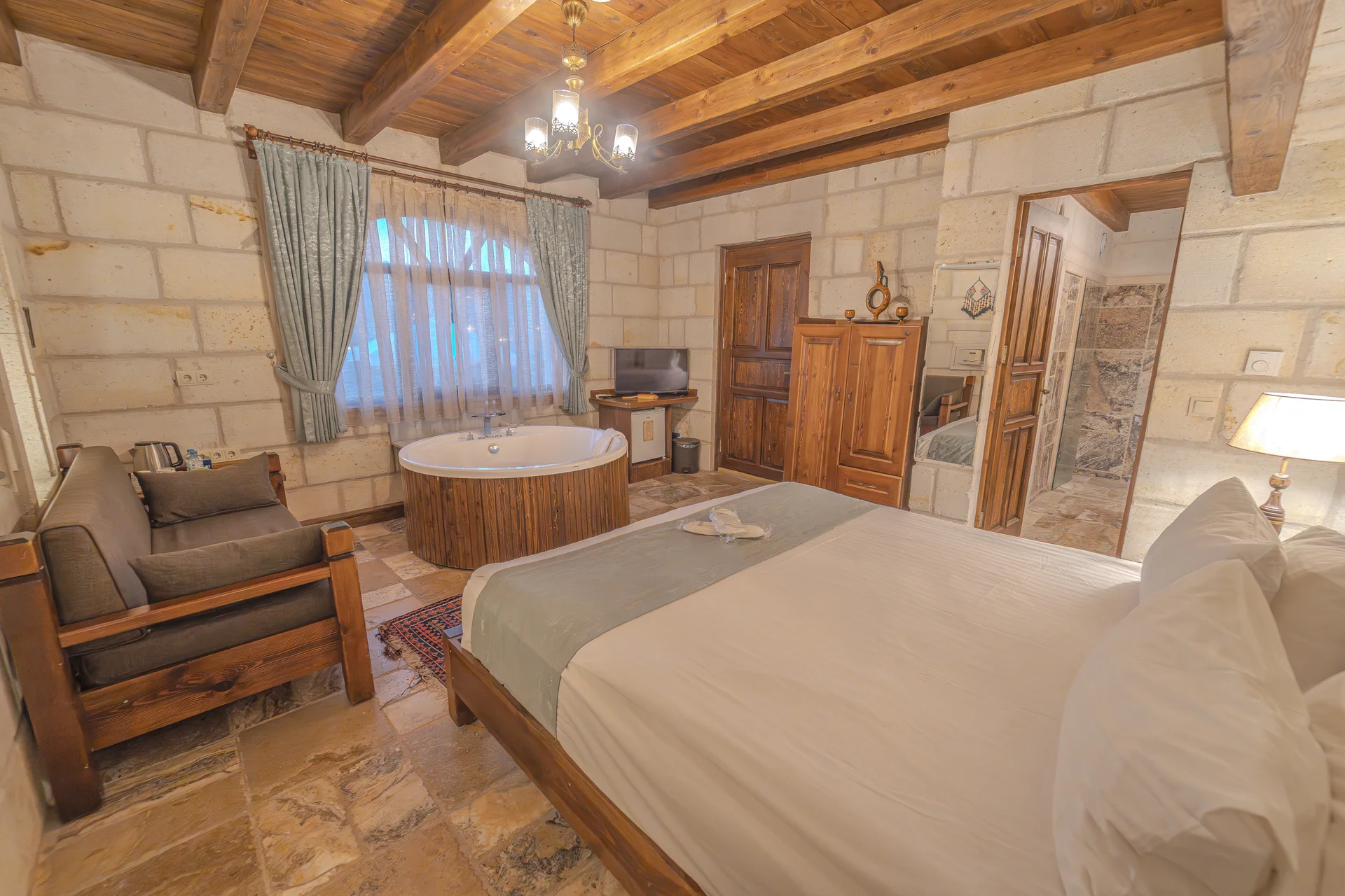 The room is equipped with an underfloor heating system for comfort during your stay. With a 22 m² layout, this standard cave room can comfortably accommodate 2 guests and is ideal for couples seeking an affordable and authentic cave hotel experience in Cappadocia.